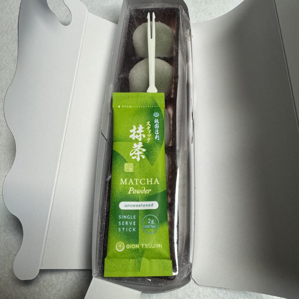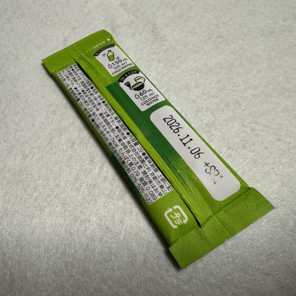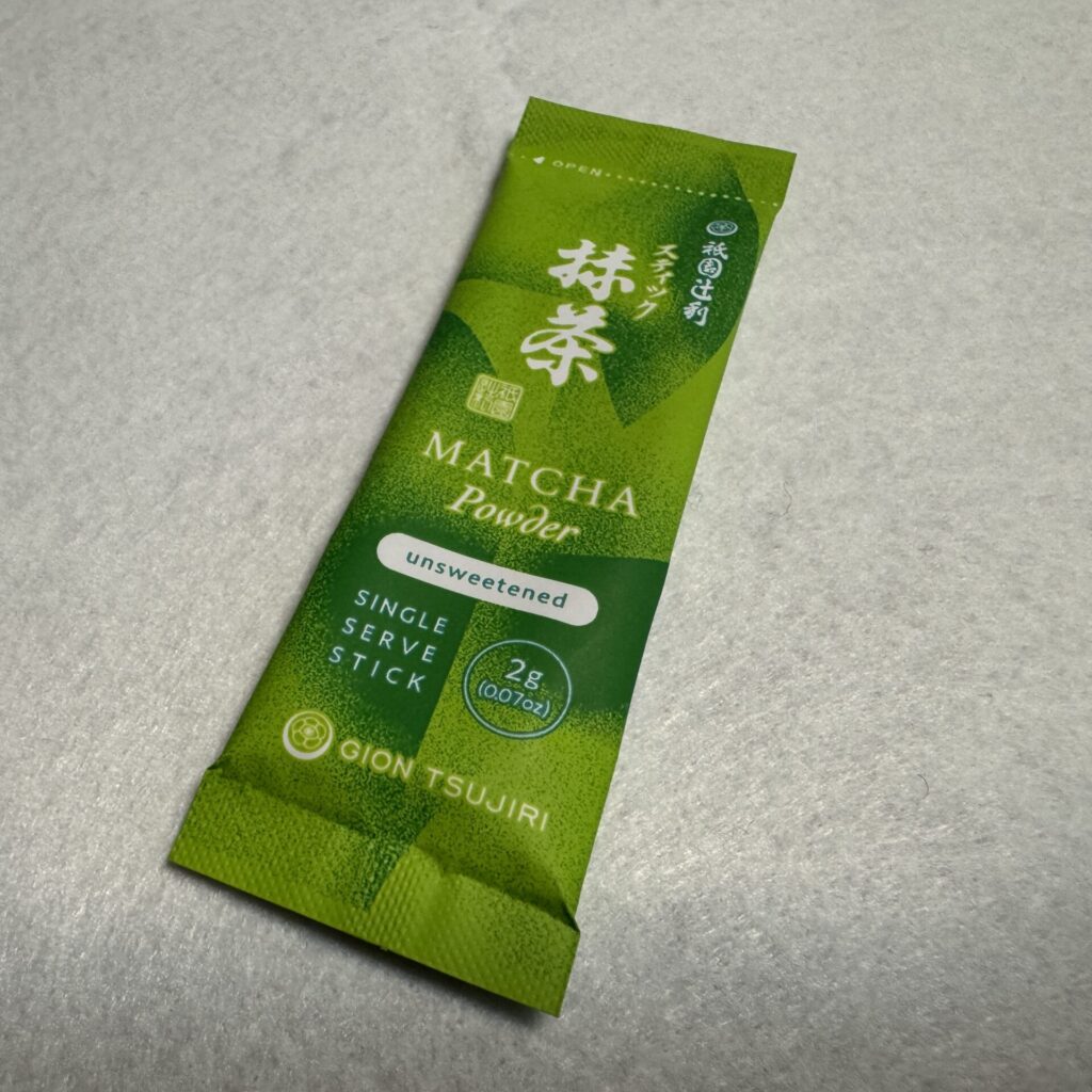 アルミ袋に入った抹茶とプラスチック楊枝が添えられています。