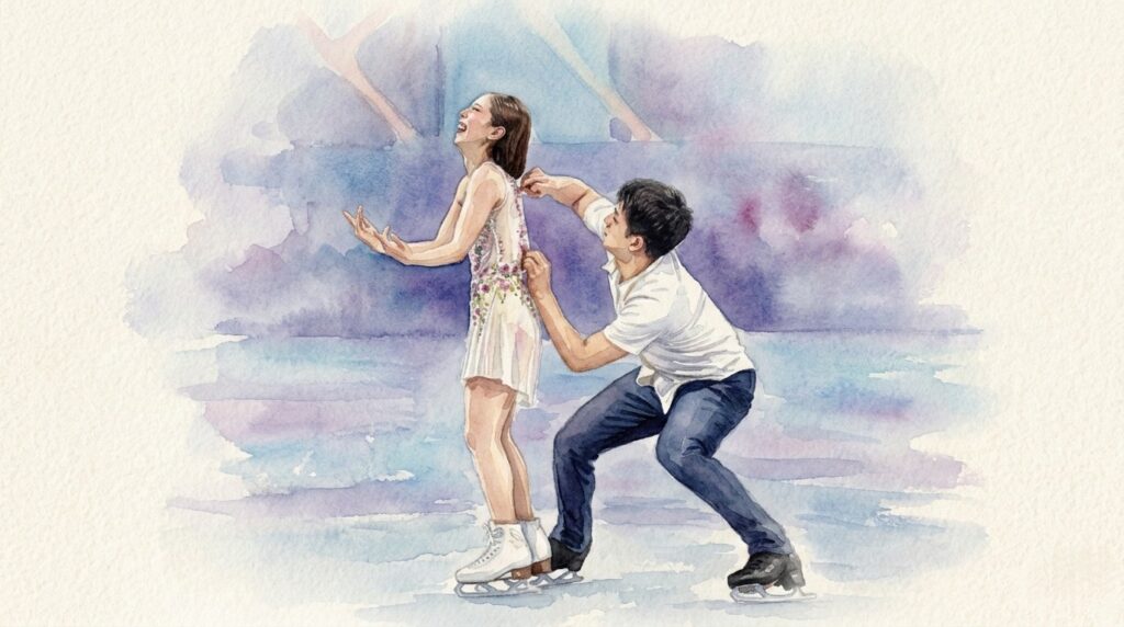 そして迎えた大会最終日のエキシビション。ここで新たな伝説が生まれます。 華麗に滑り出した2人でしたが、なんと三浦選手は衣装の背中のファスナーが全開のまま演技をスタートしてしまったのです。演技中にそれに気づいた木原選手は決して慌てず、「滑りながら考えて、デススパイラルの後なら閉められる」と冷静にリカバリーのタイミングを計算していました。 そして曲の途中で三浦選手が前で踊るパートに入った瞬間、木原選手は流れるような動きで彼女の背後に回り、振り付けの一部であるかのように極めてスマートにファスナーを上げる「神対応」を見せたのです。