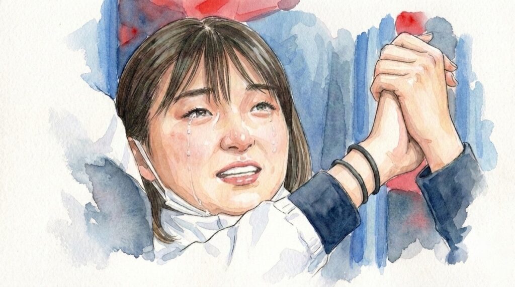 完璧なフリーを滑り終え、天高く拳を突き上げた瞬間。感動は氷の上だけにとどまりませんでした。りくりゅうの演技が放つ圧倒的な「多幸感」と「浄化のエネルギー」は、会場中の人々の感情を激しく揺さぶり、美しすぎる「涙の連鎖」を引き起こしたのです。